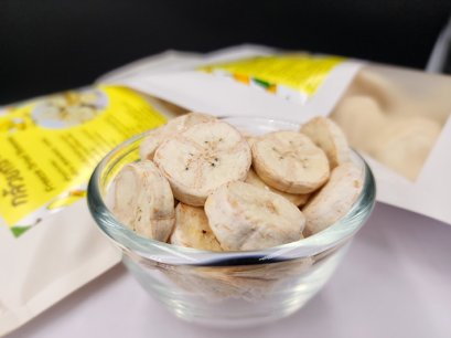 กล้วยน้ำว้าคัดเลือกความสุกพอดี นำมาตัดแต่งพอดีคำ นำไปอบให้แห้งกรอบด้วยกระบวนการแช่แข็ง (ฟรีซดราย) เพื่อให้คงคุณค่าทางอาหารในกล้วยน้ำว้า สามารถฉีกซองกินได้ทันที หรือสามารถนำไปประกอบเมนูอาหารคาว เช่น Crush กล้วยกรอบในสลัดผัก-ผลไม้ หรือประกอบเมนูอาหารหวาน เช่น โรยหน้าไอศกรีมรสชาติต่างๆ ได้อย่างเข้ากัน